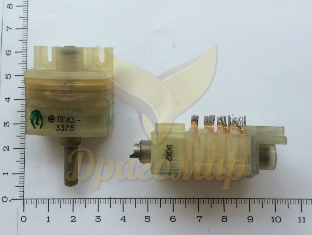 Поворотные галетные переключатели ПГ43 используются в различной радиоэлектронной аппаратуре для коммутации нагрузки мощностью до 10 Вт. Максимальное постоянное и переменное напряжение 127 В, сила тока 0,25 А. Конструкция предусматривает непосредственное впаивание выводов в плату. В зависимости от конкретной модели, переключатели могут иметь несколько секций.