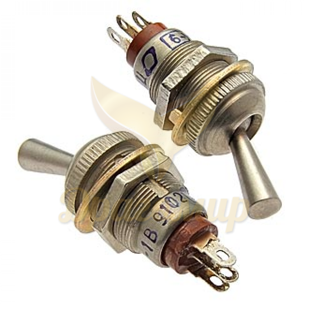 Мощный трехпозиционный переключатель перекидного типа (тумблер), рассчитан на работу с электрическими цепями напряжением 220 В (5 А), 127 В (8 А) и 27 В (15 А). Переключатели этого типа можно встретить в различной электрической и электронной аппаратуре советского периода – военной, промышленной, бытовой. Очень качественное изделие с надежной работой.