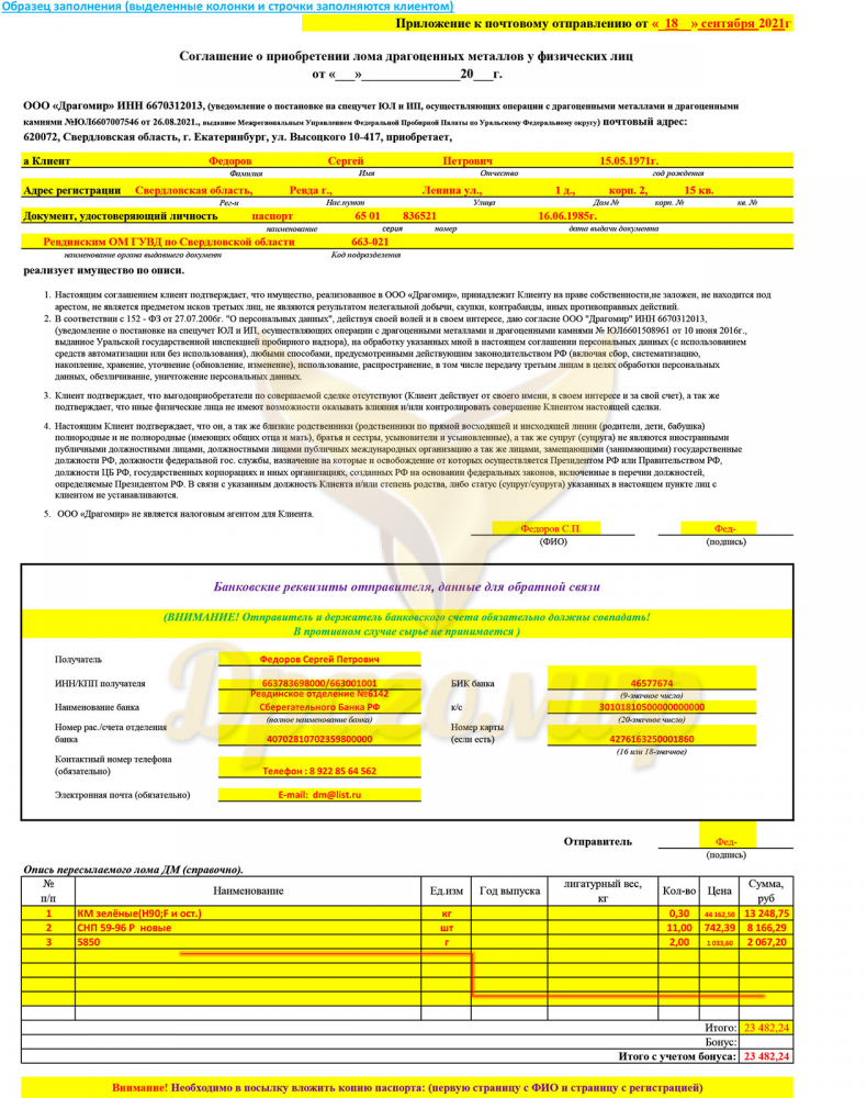 - в день получения посылки на почте или в транспортной компании заполняет акт вскрытия посылки и закупки сырья на основании вложенного соглашения и описи и с учетом цен на сырье текущего дня. Копии акта высылаются на электронную почту отправителя (после предварительного согласования с продавцом по телефону);